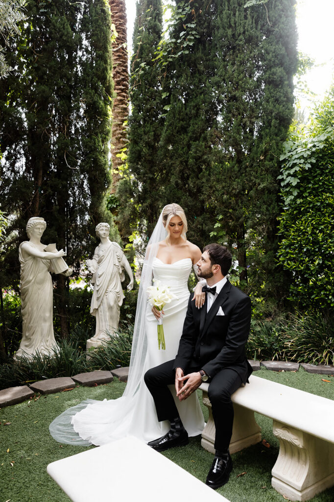 After their Venus Garden Chapel Caesars Palace wedding ceremony, Maddie and Noah stayed in the garden for a few portraits. The greenery and architecture around Caesars Palace made the perfect backdrop for romantic and elevated portraits.